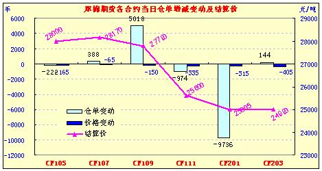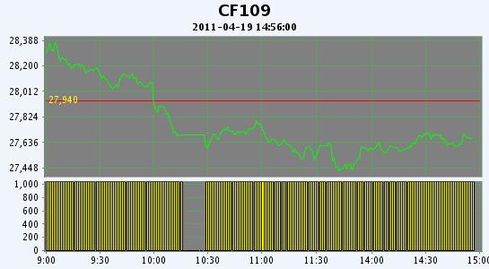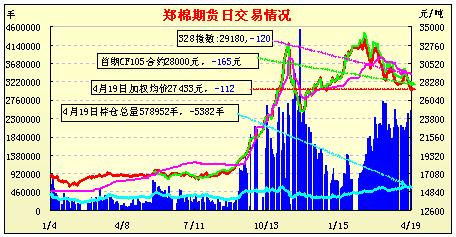 4月19日,鄭棉CF1109合約平上試,隨后在空頭賣盤打壓下走低,午后增倉創(chuàng)日低,盤中低位空頭回補(bǔ)支撐期價反彈,日線形成陰線,日內(nèi)成交量放大,持倉量小幅增加。CF1109合約日成交2177802手,日增倉5018手,終盤持倉量409104手;CF1201合約日成交331472手,日減倉9736手,終盤持倉量122064手?;久媲闆r:國內(nèi)棉花現(xiàn)貨價格繼續(xù)下探,紡織廠采購謹(jǐn)慎,各方觀望情緒濃厚,市場難以動銷。棉商或是繼續(xù)下調(diào)報(bào)價以求落袋為安或是停止報(bào)價對抗現(xiàn)貨的下跌,對后市看法出現(xiàn)分歧,紡織廠庫存積壓明顯,最多的紡廠庫存積壓在2個月左右,資金壓力繼續(xù)增加。因高盛公司預(yù)期未來幾個月棉花市場走弱,國際棉花電子盤遭受打壓,受此影響,今日國內(nèi)電子盤震蕩下行,電子撮合和鄭棉9月均價均跌破28000元。