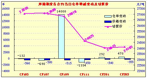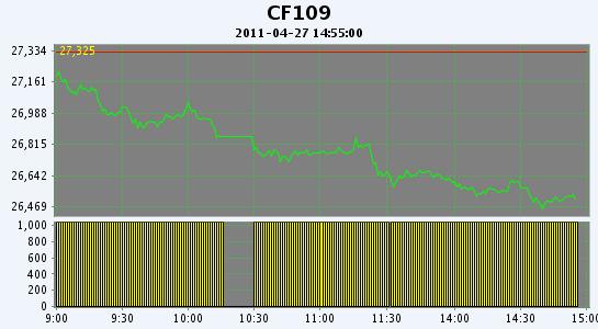 4月27日,鄭棉CF1109合約平開(kāi),盤(pán)中在空頭賣(mài)盤(pán)打壓下走低,午后創(chuàng)日低,尾盤(pán)在空頭短線回補(bǔ)支撐下反彈,日線形成陰線,日內(nèi)成交量放大,持倉(cāng)量增加。CF1109合約日成交1750796手,日增倉(cāng)14008手,終盤(pán)持倉(cāng)量386772手;CF1201合約日成交308778手,日增倉(cāng)292手,終盤(pán)持倉(cāng)量131968手?;久媲闆r:不少企業(yè)認(rèn)為當(dāng)前的市場(chǎng)形勢(shì)倍受折磨,作為原料供應(yīng)的棉花企業(yè),皮棉銷售斷檔脫節(jié),盡最大的銷售意愿依舊是價(jià)格越來(lái)越低,庫(kù)存幾乎成靜態(tài)走量;雖然不少棉企恐慌心態(tài)加劇,但在價(jià)格底線內(nèi)仍堅(jiān)持杜絕“大出血”式的銷售。而紡織企業(yè)也一樣備受承壓,一些中型的紡織企業(yè)紗線庫(kù)存較高,減產(chǎn)原料替代現(xiàn)象頻增。市場(chǎng)各方壓力均比較大。籽棉收購(gòu)方面,市場(chǎng)資源量比較少,加之前方皮棉銷售價(jià)格一路下跌,因此籽棉收購(gòu)報(bào)價(jià)繼續(xù)下降,棉廠基本已經(jīng)停收。不少企業(yè)認(rèn)為當(dāng)前市場(chǎng)弱勢(shì)難改,儼然已經(jīng)進(jìn)入了疲軟期。