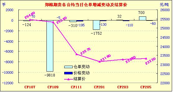 5月17日,近月收漲停,今日鄭棉CF1109合約高開(kāi),早盤(pán)在空頭賣盤(pán)打壓下走低,午前創(chuàng)日低,午后低位空頭回補(bǔ)推動(dòng)期價(jià)反抽,此后橫向盤(pán)整,日線形成高開(kāi)長(zhǎng)下影線的陰線,日內(nèi)成交量放大,持倉(cāng)量減少。CF1109合約日成交3104488手,日減倉(cāng)9818手,終盤(pán)持倉(cāng)量464952手;CF1201合約日成交268584手,日減倉(cāng)1752手,終盤(pán)持倉(cāng)量133354手?;久媲闆r:現(xiàn)貨價(jià)格繼續(xù)下跌,市場(chǎng)觀望情緒濃厚,棉紗銷售依舊不暢,紡織企業(yè)用棉意愿下降,市場(chǎng)成交無(wú)變化。有個(gè)別的軋花廠在收購(gòu),但是數(shù)量有限且對(duì)質(zhì)量掌控嚴(yán)格。電子盤(pán)在24000元/噸一線的時(shí)候得到支撐,今日國(guó)內(nèi)兩個(gè)電子盤(pán)主力合約紛紛大幅反彈,多頭活動(dòng)明顯。