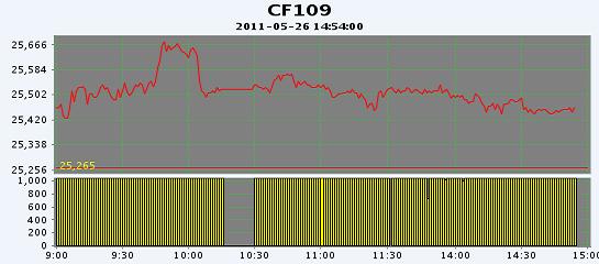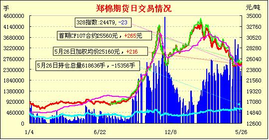 5月26日,鄭棉CF1109合約小幅高開,早盤橫向整理后受到空頭回補(bǔ)支撐上沖,隨后減倉下行盤整,日線形成陽線星,日內(nèi)成交量萎縮,持倉量大幅減少;鄭棉CF1201合約早盤大幅高開,盤中在多頭買盤推動(dòng)下上沖,此后高位增量整理,CF1109合約日成交1249644手,日減倉51018手,終盤持倉量386922手;CF1201合約日成交597554手,日增倉36760手,終盤持倉量201968手。 基本面情況:現(xiàn)貨價(jià)格無改觀,成交也不多,紡織廠采購想壓低價(jià)錢,可是棉商和棉企既想出貨又不想把價(jià)格弄得太低,所以現(xiàn)貨成交繼續(xù)不旺。紡織廠紗線銷售也沒有多大的改觀,紗廠的庫存沒減少,但是也沒見增加,動(dòng)態(tài)庫存。今日電子盤繼續(xù)上漲,市場炒作南方的干旱和電荒。目前市場依舊是老生常談,關(guān)注紡織廠的情況,畢竟紡織廠一旦運(yùn)轉(zhuǎn)起來,棉花的“春天”也就不遠(yuǎn)了,不過目前紡織廠的資金是最大的難題,銀行的信貸緊縮,庫存積壓資金,很難讓紡織廠喘口氣。