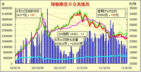 6月22日,鄭棉CF1109合約高開,早盤在多頭逢高平倉的壓制下走低,隨后橫盤整理,尾盤受集中平倉盤打壓下滑,日線形成高開小陰線,日內成交量放大,持倉量增加;CF1201合約早盤慣性上沖后在空頭賣盤打壓下回落盤整,午后盤跌,尾盤增倉下滑后在短線回補盤支撐下反彈,日線形成小陰線,日內成交量萎縮,持倉量微增。CF1109合約日成交154330手,日增倉1724手,終盤持倉量243416手;CF1201合約日成交1002550手,日增倉7146手,終盤持倉量338880手?;久媲闆r:織廠資金異常緊張,加上一些地區(qū)目前正值麥收,許多紡織廠已經給工人放假了,現(xiàn)貨采購動向繼續(xù)減少,皮棉現(xiàn)貨價格繼續(xù)下跌。由于南方的降雨以及局部干旱,市場關注重點轉移至新花上,17、18兩日長江流域中下游地區(qū)再次遭受強降雨,棉區(qū)中地勢較低的地區(qū)出現(xiàn)內澇,地勢較高地區(qū)尚未產生影響,另據(jù)了解湖北公安地區(qū)受災影響較大;由于降雨分布不均,湖北西北部、安徽淮河以北及江蘇北部地區(qū)仍有旱情存在。本周開始長江流域進入汛期,期間防洪抗?jié)秤葹殛P鍵。目前降雨導致內澇對棉花影響有限,但是如果持續(xù)要月底,大部分棉區(qū)現(xiàn)蕾后,棉花長勢將有所影響,產量也將堪憂。