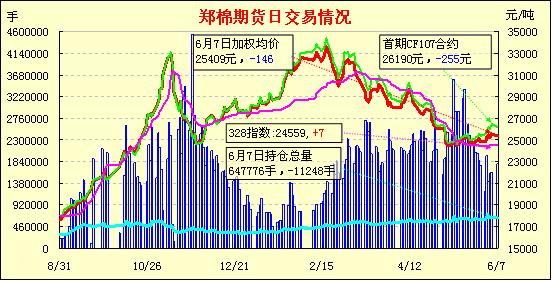 6月7日,端午節(jié)期間紐期沖高回落,影響今日鄭棉CF1109合約低開,早盤下探后在多頭買盤支撐下回升,午間多頭平倉壓制期價下滑盤整,尾盤在空頭回補的支撐下反彈,日線形成低開小陰線,日內(nèi)成交量變化不大,持倉量減少;鄭棉CF1201合約早盤在多頭逢低買盤推動下沖高盤整,盤中高位換后增量后下滑,午后區(qū)間震蕩,日線形成低開陰線旺,日內(nèi)成交量放大,持倉量增加。CF1109合約日成交562580手,日減倉18658手,終盤持倉量338520手;CF1201合約日成交1219408手,日增倉7536手,終盤持倉量275088手?;久媲闆r:現(xiàn)貨市場成交出現(xiàn)了一些小變化,一些小廠繼續(xù)在降價銷售,為了能銷售皮棉可謂是到處奔波;而有一部分廠面對近期電子盤的上漲和現(xiàn)貨上面的少量采購,銷售由之前的積極轉為觀望,只對那些老客戶有所成交,但是那些等級低的地產(chǎn)棉依舊很難有銷售。端午小長假來臨,紡織企業(yè)依舊對后市不看好,庫存壓力以及資金壓力依然較大,多選擇放假。