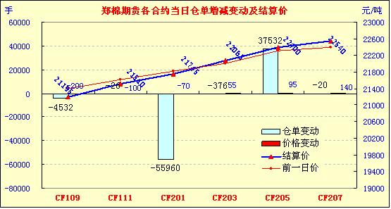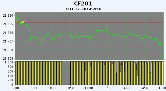 7月28日,鄭棉主要合約早盤小幅低開,CF1109合約在多頭平倉打壓下走低盤整,午后加速下滑,終盤收于日低,日線形成陰線,日內(nèi)成交量萎縮,持倉量繼續(xù)減少;CF1201合約受平倉盤打壓下滑盤整,尾盤平倉盤再涌,期價隨之跳水收低,日線形成陰線,日內(nèi)成交量萎縮,持倉量減少。CF1109合約日成交16972手,日減倉4532手,終盤持倉量39064手;CF1201合約日成交773230手,日減倉55960手,終盤持倉量599794手。