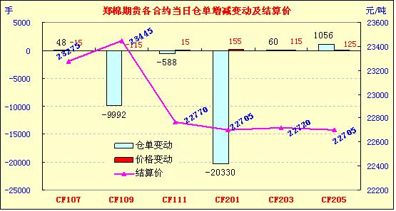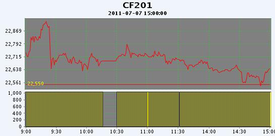 7月7日,鄭棉主要合約全線低開,CF1109合約在多頭平倉(cāng)的打壓下波段走低,尾盤小幅反彈,日線形成小陰線,日內(nèi)成交量放大,持倉(cāng)量下降;CF1201合約早盤沖高后在平倉(cāng)盤的打壓下回落,此后震蕩,午后盤跌下滑,尾盤在空頭短線回補(bǔ)的支撐下反彈,日內(nèi)成交量較前一日下滑,持倉(cāng)量減少。CF1109合約日成交150254手,日減倉(cāng)9992手,終盤持倉(cāng)量129036手;CF1201合約日成交1783188手,日減倉(cāng)20330手,終盤持倉(cāng)量514530手。基本面情況:現(xiàn)貨延續(xù)跌勢(shì),成交幾無(wú),有客戶反映從上周開始到本周今日幾乎沒(méi)有接到電話詢價(jià),為了盡快歸還農(nóng)發(fā)行的貸款企業(yè)已經(jīng)在賠錢銷售。市場(chǎng)的低迷不振,參與者的信心受挫,對(duì)于后市只求落袋為安,面對(duì)虧損只能默默忍受。目前市場(chǎng)小包弱四級(jí)棉報(bào)價(jià)在19000-20000元/噸,公檢大包價(jià)格在21000-22000元/噸左右;下游紗線價(jià)格繼續(xù)下跌,32S棉紗價(jià)格 29000-30000元/噸,40S 棉紗高配32000-34000元/噸。