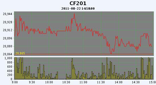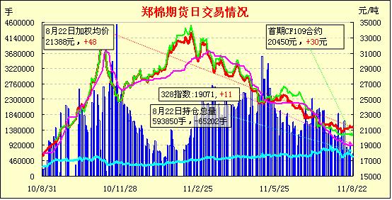 8月22日,鄭棉主要合約微幅低開(kāi),CF1201合約早盤反復(fù)震蕩,午后在多頭平倉(cāng)打壓走低,日線形成小陰線星,日內(nèi)成交量萎縮,持倉(cāng)量繼續(xù)減少;CF1205合約早盤一度受到多頭買盤支撐沖高,但是平倉(cāng)盤抑制期價(jià)上行,午后平倉(cāng)盤增加,期價(jià)隨之震蕩下滑,尾盤收弱,日線形成小陰線,日內(nèi)成交量萎縮,持倉(cāng)量減少。CF1201合約日成交62776手,日減倉(cāng)17718手,終盤持倉(cāng)量226348手;CF1205合約日成交601448手,日減倉(cāng)50023手,終盤持倉(cāng)量346928手。基本面情況:由于歐洲主權(quán)債務(wù)危機(jī)仍在持續(xù),再加上美國(guó)經(jīng)濟(jì)欠佳,導(dǎo)致國(guó)內(nèi)外股市和商品市場(chǎng)大幅波動(dòng)。受其影響,國(guó)內(nèi)電子盤出現(xiàn)小幅下跌的局面。而當(dāng)前國(guó)內(nèi)現(xiàn)貨市場(chǎng)影響相對(duì)較小,今日棉花現(xiàn)貨市場(chǎng)繼續(xù)維持穩(wěn)定,但是疲軟的現(xiàn)狀并沒(méi)有得到改變。近期內(nèi)美國(guó)以及巴基斯坦棉產(chǎn)區(qū)均出現(xiàn)降雨,而前期國(guó)內(nèi)黃河流域各棉產(chǎn)區(qū)也出現(xiàn)大范圍陰雨天氣,大部分地區(qū)新花整體長(zhǎng)勢(shì)良好,但局部由于前段時(shí)間高溫高濕天氣和雨水較多的影響,密度大的棉株底部棉桃開(kāi)始霉?fàn)€。由于當(dāng)前市場(chǎng)缺乏利好支撐,現(xiàn)貨市場(chǎng)后期依舊有較多隱憂。