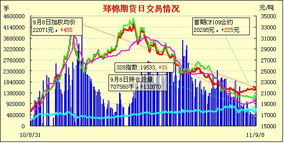 9月8日,鄭棉主要合約小幅高開,主要合約在多頭買盤推動(dòng)下沖高,隨后增量盤整,日線形成高開陽(yáng)線,日內(nèi)成交量放大,持倉(cāng)量增加。CF1201合約日成交67818手,日減倉(cāng)314手,終盤持倉(cāng)量152010手;CF1205合約日成交1156528手,日增倉(cāng)129452手,終盤持倉(cāng)量517882手?;久媲闆r:國(guó)內(nèi)棉花現(xiàn)貨市場(chǎng)價(jià)格平穩(wěn)。對(duì)于新棉收購(gòu),過多的企業(yè)依舊躊躇,目前新棉收購(gòu)內(nèi)地好4級(jí)和弱3級(jí)的皮棉的成本已經(jīng)在18500元/噸以上,而新疆質(zhì)量等級(jí)好的收購(gòu)價(jià)能達(dá)到9元/公斤,因此大型棉花企業(yè)輕易不敢入市收購(gòu)。當(dāng)前由于入市企業(yè)零星,紡織企業(yè)為滿足自身的用棉需求,也跟棉花企業(yè)提前簽訂訂單,只是量相對(duì)比較少。因此軋花廠忽開忽停,主要為滿足紡織訂單需求。當(dāng)前紡織企業(yè)喜憂參半,喜得是銷售慢慢好轉(zhuǎn),存貨下降;憂的是棉花行情到底會(huì)是什么樣的走向,目前不光紡織企業(yè)諸多迷茫,棉花企業(yè)也更多的迷茫,因此不少企業(yè)處在收于不收的糾結(jié)狀態(tài)中。另外,外棉到港價(jià)格也比較高,折合3級(jí)價(jià)格在21000元左右。