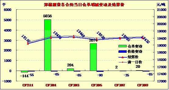 今日鄭棉平開(kāi)震蕩,持倉(cāng)量增加。CF1301開(kāi)盤價(jià)19400元/噸,最高價(jià)19485元/噸,最低價(jià)19360噸,收盤價(jià)19435元/噸,持平;日成交量為61522手;持倉(cāng)量增加,日增倉(cāng)5036手至224336手。CF1305收于19305元/噸,跌15元/噸;日成交量為23174手;持倉(cāng)量增2674至122524手。11日,美國(guó)農(nóng)業(yè)部公布的棉花供需預(yù)測(cè)報(bào)告利空,使得紐約期棉下跌,近期12月合約收于70.71美分/磅,跌139點(diǎn),3月合約收于71.40美分,跌162點(diǎn)。國(guó)外市場(chǎng)雖然跌幅較大,但是國(guó)內(nèi)市場(chǎng)反應(yīng)平淡,預(yù)計(jì)后期還是以震蕩為主。10月11日,計(jì)劃收儲(chǔ)99600噸,實(shí)際成交58720噸,成交比例59%。其中,新疆庫(kù)點(diǎn)計(jì)劃收儲(chǔ)45000噸,實(shí)際成交44800噸,成交比例99.5%;內(nèi)地庫(kù)計(jì)劃收儲(chǔ)45600噸,實(shí)際成交13920噸,成交率31%。截止11日2012年度棉花臨時(shí)收儲(chǔ)累計(jì)成交669290噸,新疆累計(jì)成交546320噸,內(nèi)地累計(jì)成交122970噸。美國(guó)農(nóng)業(yè)部公布10月份供需報(bào)告,整個(gè)供需報(bào)告仍然偏空。2012//13年度上調(diào)全球產(chǎn)量50.03萬(wàn)噸至2532.07萬(wàn)噸,其中美國(guó)略調(diào)增3.88萬(wàn)噸至376.39萬(wàn)噸,印度調(diào)增21.77萬(wàn)噸至555.21萬(wàn)噸,中國(guó)調(diào)增10.89萬(wàn)噸至685.84萬(wàn)噸;貿(mào)易量略有調(diào)減,進(jìn)出口分別調(diào)減2.94萬(wàn)噸和3.16萬(wàn)噸至793.86萬(wàn)噸和793.82萬(wàn)噸,其中,中國(guó)進(jìn)口量大幅調(diào)減,調(diào)減21.77萬(wàn)噸至239.50萬(wàn)噸,其他國(guó)家變化不大;消費(fèi)量調(diào)減14.81萬(wàn)噸至2326.92萬(wàn)噸,其中中國(guó)調(diào)減43.55萬(wàn)噸至783.82萬(wàn)噸,印度調(diào)增10.89萬(wàn)噸至479萬(wàn)噸;全球期末庫(kù)存量調(diào)增56.46萬(wàn)噸至1722.51萬(wàn)噸,中國(guó)庫(kù)存量為797.02萬(wàn)噸,調(diào)增23.95萬(wàn)噸,印度調(diào)減11.98萬(wàn)噸至189.95萬(wàn)噸,美國(guó)調(diào)增6.53萬(wàn)噸至122.93萬(wàn)噸,巴西調(diào)增11.98萬(wàn)噸,澳大利亞調(diào)增1.26萬(wàn)噸。