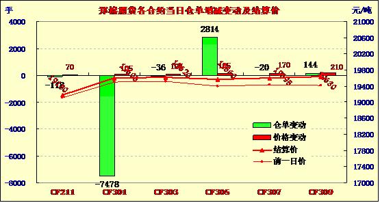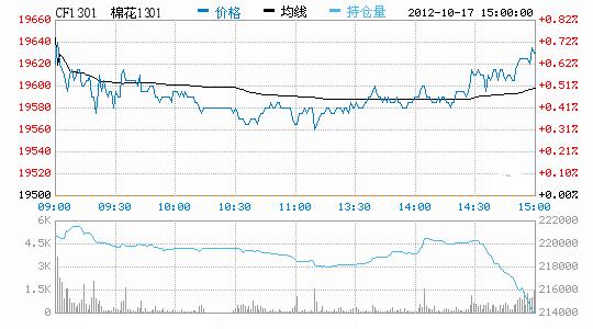 10月17日高開收星,減倉突破。今日鄭棉CF1301合約高開,早盤在多頭平倉壓制下調(diào)整,午后在空頭回補推動下回升,日線形成高開星線,主力合約成交量放大,持倉量近減遠增。CF1301合約日成交86912手,日減倉7478手,終盤持倉量213986手;CF1305合約日成交40476手,日增倉2814手,終盤持倉量122016手。基本面情況:各棉區(qū)收購雖然整體進度略有放緩,但日收購量仍然尚可,大廠仍以交儲為第一選擇進行收購,小廠則因現(xiàn)貨市場低迷,難以操作等原因入市謹慎。新疆方面,由于近日收儲的庫點不僅較少,而且每個庫的收儲量都不大,所以部分地區(qū)棉企交儲競拍非常激烈。下游方面,下游紗廠家?guī)齑嬉廊浑y以動銷,僅出貨稍有好轉(zhuǎn)。