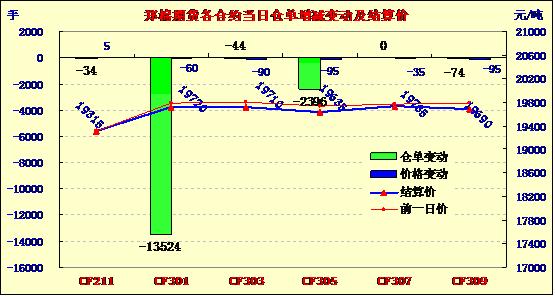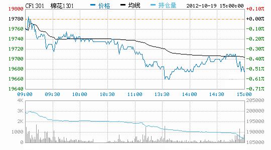 10月19日低開下跌,多單回吐。今日主要合約低開,午前在多頭平倉壓制下盤整,午后在空頭回補(bǔ)推動下反彈脫離低點(diǎn),日線形成低開小陰線,主力合約成交量萎縮,持倉量減少。CF1301合約日成交62328手,日減倉13524手,終盤持倉量187168手;CF1305合約日成交39452手,日減倉2396手,終盤持倉量121418手。基本面情況:十月下旬以來,各棉區(qū)籽棉采收進(jìn)度有所加快,但棉副產(chǎn)品行情較為疲軟,尤其是棉籽價格不斷下跌,給棉花企業(yè)經(jīng)營帶來較大壓力,部分原本打算囤積棉籽的棉企對后市持悲觀態(tài)度,也就順應(yīng)行情進(jìn)行了銷售。新疆方面,交儲競拍日趨激烈,甚至有部分軋花廠已連續(xù)一周多沒有競拍成功。下游方面,全棉紗略有價格上的微調(diào),低配氣流紡紗價格讓利。