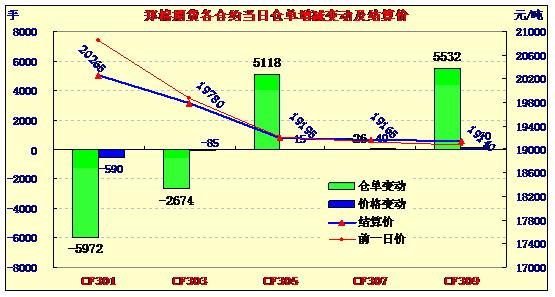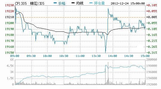 12月24日,鄭棉CF1305合約高開,盤中在空賣盤壓制下走低,午后增量反抽,隨后橫向盤整,日線形成長1/2下影線的陰線,日內(nèi)成交量溫和放大,持倉量增加。CF1301合約日成交15852手,日減倉5972手,終盤持倉量22374手;CF1305合約日成交65504手,日增倉5118手,終盤持倉量196946手?;久媲闆r:部分地區(qū)棉農(nóng)因擔(dān)心后期價格有變,不敢留棉,大多順價銷售。棉副方面,棉油、粕行情上漲之勢停止;棉籽貨源漸少對行情支撐力度較大,基本保持近期價位。下游方面,全棉紗今天交易也很低,部分繼續(xù)的業(yè)戶散量采購。