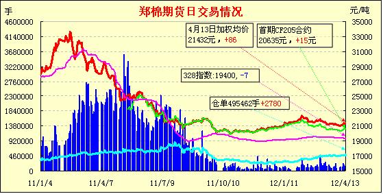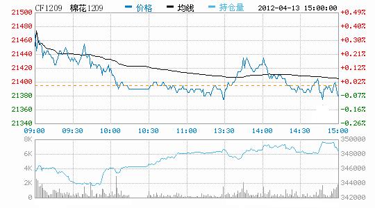4月13日,鄭棉CF1209合約高開,早盤在空頭賣盤打壓下走低,午后一度反彈,但是仍受到賣盤打壓收弱,日線形成高開陰線,主要合約成交量放大,持倉量近減遠增。CF1205合約日成交4334手,日減倉2124手,終盤持倉量53046手;CF1209合約日成交112308手,日增倉3190手,終盤持倉量348540手?;久媲闆r:目前正值棉花春播時節(jié),近期北方氣溫不穩(wěn)定再加上南方持續(xù)降雨,春播普遍較去年略晚一些。今日現貨銷售仍無起色,皮棉價格穩(wěn)中有跌。下游紡企采購不積極,部分有存棉的企業(yè)急于銷售,甚至直接與紡企聯系,并且送貨到廠,但由于資金偏緊,紡企延期付款的現象較多。棉副方面,棉籽受貨源漸少支撐價格基本穩(wěn)定;外圍回落,棉油、粕上漲乏力;棉短絨價格波動有限;棉殼穩(wěn)中有漲。