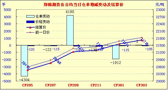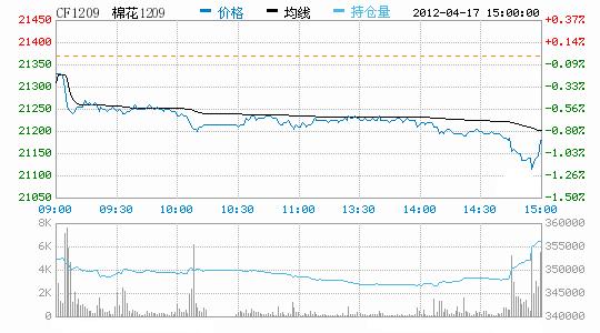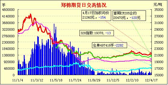 4月17日,鄭棉CF1209合約大幅低開,早盤在多頭平倉壓制下走低,午后增倉下滑,尾盤在多頭承接買盤的支撐下反抽,日線形成低開陰線,主要合約成交量放大,持倉量先減后增。CF1205合約日成交8202手,日減倉4304手,終盤持倉量47814手;CF1209合約日成交158858手,日增倉4190手,終盤持倉量356344手?;久媲闆r:隨著收儲(chǔ)的結(jié)束以及紡織形勢的迷茫,棉花市場行情延續(xù)不振的態(tài)勢,現(xiàn)貨交易不但成交冷清,價(jià)格還略有下降。部分地區(qū)小廠采用質(zhì)押的方式將皮棉留存到現(xiàn)在,本想等收儲(chǔ)結(jié)束后高等級資源稀少價(jià)格上漲時(shí),再出售來獲取一定利潤,但以現(xiàn)在這樣的局面,加上存棉費(fèi)用的增加,不賺反虧。棉副方面,棉籽行情依然堅(jiān)挺;棉油、粕行情止?jié)q趨穩(wěn),成交情況尚可;棉短絨外圍稍有好轉(zhuǎn),報(bào)價(jià)穩(wěn)中有升。下游方面,由于棉紗的總體出貨量還不及以往的一個(gè)月,十分差勁,因此市場看淡心里延續(xù),行情疲軟,實(shí)際出貨較少。