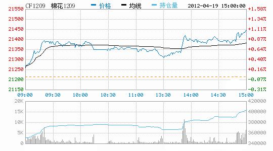 4月19日,鄭棉CF1209合約高開,早盤在多頭買盤推動(dòng)下走高震蕩,午后一度調(diào)整,隨后多頭買盤再度涌入,推動(dòng)期價(jià)回穩(wěn)收強(qiáng),日線形成實(shí)體陽(yáng)線,主要合約成交量成倍放大,持倉(cāng)量大幅增加。CF1205合約日成交8066手,日減倉(cāng)2458手,終盤持倉(cāng)量43556手;CF1209合約日成交282888手,日增倉(cāng)51626手,終盤持倉(cāng)量403486手?;久媲闆r:各地皮棉行情表現(xiàn)續(xù)弱,成交改觀不大,繼昨日電子盤行情大跌后,今日進(jìn)入震蕩階段,對(duì)于現(xiàn)貨報(bào)價(jià)依然偏空,而且企業(yè)出貨仍困難,外棉具有競(jìng)爭(zhēng)優(yōu)勢(shì)。下游紡織企業(yè)出貨意愿較強(qiáng),成交價(jià)可議,紗線行情依然疲軟,原料采購(gòu)積極性不高。此外,大宗油脂油料行情表現(xiàn)轉(zhuǎn)弱的情況下,棉油、粕行情止?jié)q有回落跡象,使得棉籽高位有所松動(dòng)。春播在即,各地化肥、農(nóng)膜以及農(nóng)藥普遍同比上漲,棉價(jià)弱勢(shì)的情況下,物化成本增加對(duì)新棉種植有一定影響。
