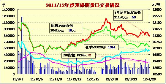 4月26日,鄭棉CF1209合約平開,早盤在多頭買盤支撐下沖高,隨后受空頭賣盤壓制回落,此后橫向窄幅整理,日線形成陰線星,主要合約成交量萎縮,持倉(cāng)量增加。CF1205合約日成交5228手,日減倉(cāng)2414手,終盤持倉(cāng)量30120手;CF1209合約日成交49144手,日增倉(cāng)1546手,終盤持倉(cāng)量371072手。基本面情況:由于紗線行情疲軟,紡織企業(yè)傾向使用外棉,但何時(shí)發(fā)放配額尚無(wú)定論。新疆方面,新疆棉內(nèi)地倉(cāng)庫(kù)的報(bào)價(jià)和成交價(jià)均未調(diào)整,但銷量沒有起色。近幾日因?yàn)榇箫L(fēng)降溫及沙塵天氣,北疆部分地區(qū)需要復(fù)播,南疆地區(qū)出苗情況較好。棉副方面,棉籽價(jià)格高位運(yùn)行;棉油、粕受外圍支撐,下行空間有限,以穩(wěn)為主;棉短絨、棉殼成交一般,價(jià)格波動(dòng)不大。