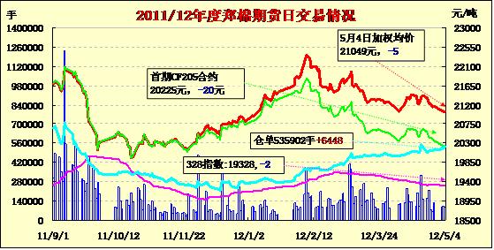 5月4日期棉增倉(cāng)反彈,成交縮量。今日鄭棉CF1209合約平開(kāi),早盤(pán)增倉(cāng)下探后盤(pán)整,午后在多頭買(mǎi)盤(pán)推動(dòng)下沖高震蕩,日線形成陽(yáng)線,主要合約成交量萎縮,持倉(cāng)量增加。CF1209合約日成交75362手,日增倉(cāng)3952手,終盤(pán)持倉(cāng)量396258手;CF1301合約日成交17182手,日增倉(cāng)2638手,終盤(pán)持倉(cāng)量92028手?;久媲闆r:五一過(guò)后,因棉市仍難有起色,有庫(kù)存的企業(yè)出貨意愿較強(qiáng),為了回籠資金,部分企業(yè)甚至虧本銷(xiāo)售。電子盤(pán)行情也不容樂(lè)觀,市場(chǎng)整體的觀望情緒仍濃厚,市場(chǎng)多在靜待配額政策的后續(xù)指引。 棉副方面,資源稀少,棉籽價(jià)格續(xù)跌;外圍不佳棉油穩(wěn)中有降;棉粕、短絨行情暫時(shí)穩(wěn)定。