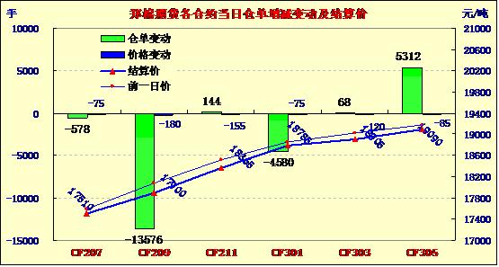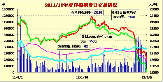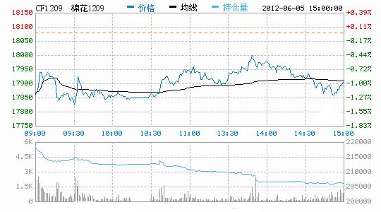 6月5日鄭棉期貨減倉反彈,報收小陽。今日鄭棉近期合約跳空低開,遠期合約小幅高開,早盤橫向整理,午后在空頭回補的支撐下反彈震蕩,日線形成低開小陽線,遠期合約收高開陽線星,近期合約成交量放大,遠月成交萎縮,持倉量減少。CF1209合約日成交102844手,日減倉13576手,終盤持倉量206412手;CF1301合約日成交234462手,日減倉4580手,終盤持倉量246888手?;久媲闆r:現(xiàn)貨市場更加疲軟不堪,皮棉價格持續(xù)下跌,成交清淡,行情難現(xiàn)曙光。棉副方面,棉籽價格穩(wěn)定,貨源稀少,成交不理想;外圍油脂油粕行情低迷,棉油、粕價格受限;皮棉價格下跌,棉短絨價格也是難有提振。