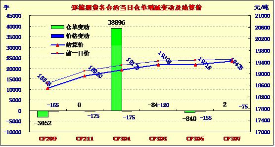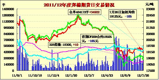 7月26日,鄭棉CF1301合約低開,早盤反彈后受空頭賣盤壓制下滑,隨后橫向整理,尾盤在空頭回補(bǔ)支撐下反彈,日線形成陰線星,日內(nèi)成交量放大,持倉(cāng)量大幅增加。CF1301合約日成交249072手,日增倉(cāng)38896手,終盤持倉(cāng)量335038手;CF1305合約日成交23056手,日減倉(cāng)840手,終盤持倉(cāng)量71918手?;久媲闆r:受國(guó)際經(jīng)濟(jì)環(huán)境再度轉(zhuǎn)弱,大宗商品整體回落,市場(chǎng)避險(xiǎn)情緒增加等因素影響,今日電子盤跌幅較大,但對(duì)現(xiàn)貨市場(chǎng)影響有限,皮棉價(jià)格保持穩(wěn)定,成交依然冷清。棉副方面,市場(chǎng)上棉副產(chǎn)品因貨源稀少支撐,行情波動(dòng)有限,棉油表現(xiàn)轉(zhuǎn)弱,棉粕表現(xiàn)仍堅(jiān)挺,棉短絨、棉殼行情尚可。下游方面,棉紗市場(chǎng)整體運(yùn)行平穩(wěn),雖詢價(jià)略有增多,但市場(chǎng)成交較少,各紗廠仍以消化庫(kù)存為主,個(gè)別廠家有小單成交。