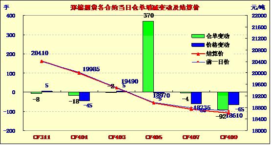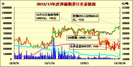 10月16日,鄭棉CF1401合約平開,早盤調(diào)整后在空頭回補(bǔ)與多頭買盤支撐下反彈,日線形成1/2下影線的陰線,日內(nèi)成交量萎縮,持倉量變化不大;CF1405合約平開,早盤上試后在平倉盤壓制下調(diào)整,日線形成小陰線,日內(nèi)成交量萎縮,持倉量增加。CF1401合約日成交3192手,日減倉18手,終盤持倉量42036手;CF1405合約日成交5120手,日增倉370手,終盤持倉量48190手。