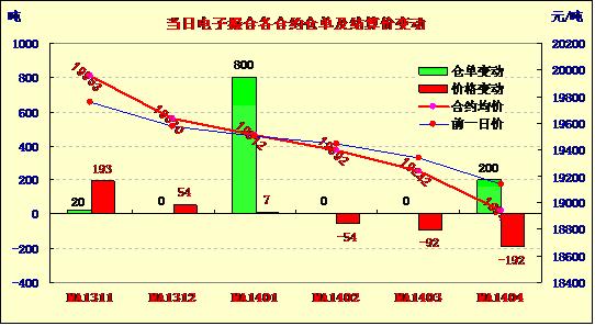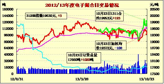 10月23日商品棉交易各合同開(kāi)盤高低不一,寬幅震蕩,均價(jià)近漲遠(yuǎn)跌。MA1311平均價(jià)19953漲193,MA1312均價(jià)19630漲54,MA1401均價(jià)19515漲7,MA1402平均價(jià)19392跌54,MA1403均價(jià)19242跌92,MA1404均價(jià)18944跌192。交易成交21400噸,較上一交易日減3880噸。MA1312和MA1404成交放量,分別成交4640噸和5000噸。訂貨量增加1020噸,累計(jì)訂貨17660噸。MA1311、MA1401和MA1404訂貨量分別增加20噸、800噸和200噸,其余合同訂貨量不變。