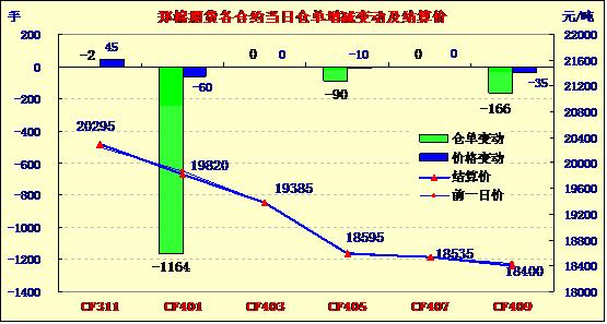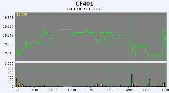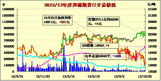 10月25日,鄭棉主要合約低開,CF1401合約盤中反彈震蕩,尾盤在空頭回補支撐下收高,日線形成低開陽線,日內(nèi)成交量放大,持倉量減少;CF1405合約早盤在多頭買盤推動下反抽,隨后在平倉盤壓制下回落,日線形成低開陽線,日內(nèi)成交量萎縮,持倉量略減少。CF1401合約日成交4442手,日減倉1164手,終盤持倉量36158手;CF1405合約日成交8938手,日減倉90手,終盤持倉量46932手。