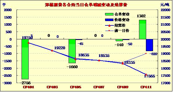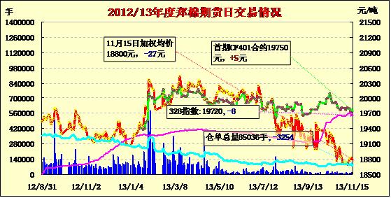 11月15日,鄭棉CF1405合約低開(kāi),盤(pán)中橫向震蕩,午后在多頭平倉(cāng)打壓下走低,日線形成低開(kāi)小陰線,日內(nèi)成交量萎縮,持倉(cāng)量減少。CF1401合約日成交4558手,日減倉(cāng)2756手,終盤(pán)持倉(cāng)量28128手;CF1405合約日成交11266手,日減倉(cāng)1660手,終盤(pán)持倉(cāng)量27794手?;久媲闆r:棉紗銷售情況不佳,常規(guī)品種雖價(jià)格靈活操作,但依然出貨不易;高支紗與低價(jià)紗出貨相對(duì)較好,但利潤(rùn)微薄;交易多要求現(xiàn)款,但賒欠依然不少,廠商消極怠工。