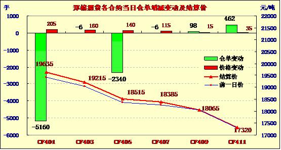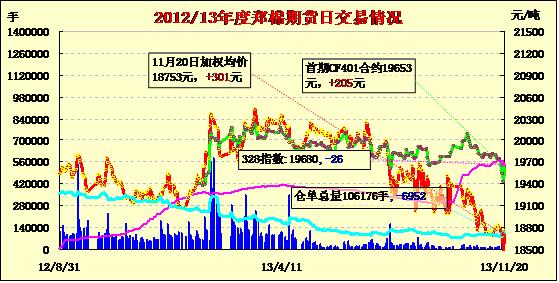 11月20日,鄭棉CF1405合約平開,早盤在空頭回補(bǔ)推動(dòng)下上行,隨后區(qū)間盤整,日線形成陽(yáng)線,日內(nèi)成交量萎縮,持倉(cāng)量減少。CF1401合約日成交8652手,日減倉(cāng)5160手,終盤持倉(cāng)量24132手;CF1405合約日成交23616手,日增倉(cāng)2340手,終盤持倉(cāng)量69016手。