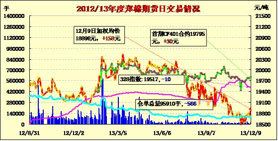12月9日,鄭棉CF1405合約高開,盤中橫向震蕩,尾盤在多頭平倉打壓下收弱,日線形成陰線星,日內(nèi)成交量放大,持倉量增加。CF1401合約日成交1988手,日減倉1520手,終盤持倉量6882手;CF1405合約日成交13112手,日增倉934手,終盤持倉量70098手。基本面情況:受拋儲(chǔ)的影響,國內(nèi)皮棉市場(chǎng)基本無成交,不少企業(yè)下調(diào)棉價(jià)心里加重。全棉紗出貨不暢,企業(yè)出貨意愿加重。港口目前有新棉陸續(xù)到港,主要為印度棉。目前部分企業(yè)選擇采購一些質(zhì)量好的港口現(xiàn)貨和保稅貨,但現(xiàn)階段外棉質(zhì)量普遍不佳,實(shí)際成交較少。