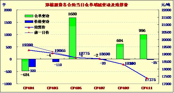 12月16日,鄭棉CF1405合約高開,早盤在空頭賣盤打壓下創(chuàng)日低,隨后空頭回補與多頭買盤推動期價反彈,日線形成陰線星,日內(nèi)成交量放大,持倉量增加。CF1405合約日成交15206手,日增倉1608手,終盤持倉量680444手;CF1409合約日成交1626手,日增倉604手,終盤持倉量13544手。
