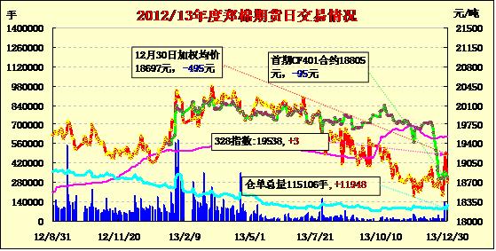 12月30日,鄭棉CF1405合約低開,早盤橫向盤整,隨后在平倉盤壓制走低,此后低位震蕩,午后空頭回補推動期價上揚,日線形成低開陽線星,日內(nèi)成交量成倍萎縮,持倉量減少。CF1405合約日成交55840手,日減倉401手,終盤持倉量63224手;CF1409合約日成交21810手,日增倉5886手,終盤持倉量24588手?;久媲闆r:元旦、春節(jié)雙節(jié)將至,下游工廠停車放假的數(shù)量不斷增加,拖累紗布市場銷售明顯萎縮,抑制了對棉花的需求。近期,紡織企業(yè)的拍儲熱情明顯不足,主要原因如下:1.由于拍儲的棉花等級不高,無法滿足紡織企業(yè)的生產(chǎn)需求。2.產(chǎn)成品市場疲軟,對棉花的需求不足。3.年終歲尾,假期將至,考慮到安全因素,不敢存大批棉花在庫。4.紡織企業(yè)資金緊張是一個普遍性的問題,所以想把有限的資金用途最大化,比如,采購更能滿足生產(chǎn)需求的棉花、還貸等。