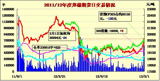 2月1日,鄭棉主要合約平開,早盤沖高后在多頭平倉打壓下回落,午后低位盤整,終盤收于日低一線,日線形成長上影線的陰線,日內成交量放大,持倉量近減遠增。CF1305合約日成交112916手,日減倉18146手,終盤持倉量106778手;CF1309合約日成交465920手,日增倉19144手,終盤持倉量211500手?;久媲闆r:近日長江流域部分地區(qū)棉農看到當?shù)刈衙迌r格有所上漲,惜售心理有所松動,交售轉變?yōu)榉e極,從而掀起春節(jié)前一輪交收小高潮。據(jù)悉部分棉企堅持收購到2月3日,以求盡快檢驗交儲回籠資金。棉副方面,由于軋花廠、油棉廠已經陸續(xù)放假,棉籽購銷放緩,價格仍高。