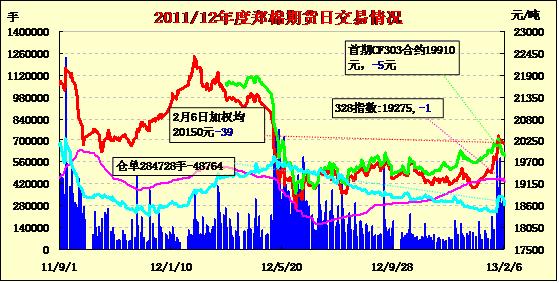 2月6日,鄭棉主要合約低開,早盤沖高回落,隨后橫向盤整,午后多頭集中平倉盤壓制期價(jià)走低,日線形成長上影線的陰線,日內(nèi)遠(yuǎn)月成交量萎縮,持倉量減少。CF1305合約日成交29590手,日減倉10536手,終盤持倉量70134手;CF1309合約日成交202272手,日減倉37794手,終盤持倉量193582手?;久媲闆r:春節(jié)假期臨近,皮棉現(xiàn)貨行情繼續(xù)維持穩(wěn)定,處于有價(jià)無市態(tài)勢。部分棉企將籽棉全部加工完畢,并將籽棉垛全部封蓋,年前不再進(jìn)行生產(chǎn),紛紛關(guān)門放假。棉副方面,油廠關(guān)門停市,棉副行情較為穩(wěn)定。據(jù)悉有部分棉企看好棉副產(chǎn)品后市行情。