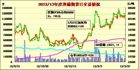 3月27日,鄭棉主要合約平開,早盤慣性上沖后在多頭平倉盤壓制下調(diào)整,午后一度在多頭買盤推動下沖高,但是尾盤再度減倉回落,日線形成小陰線,日內(nèi)成交量變化不大,持倉量增加。CF1309合約日成交87854手,日增倉1190手,終盤持倉量144440手;CF1401合約日成交4146手,日增倉420手,終盤持倉量29808手?;久媲闆r:昨日中國棉花協(xié)會二屆五次理事會暨棉花形勢分析會在湖北武漢召開。會上有關(guān)部門通報國家宏觀調(diào)控政策動向等方面情況,代表將就當前全國棉花產(chǎn)購銷形勢進行交流分析并提出政策建議。據(jù)悉,大多數(shù)棉企目前都關(guān)注下一年度國家的收儲政策,普遍對收儲托市持肯定態(tài)度,部分棉企則對來年收購信心滿滿。