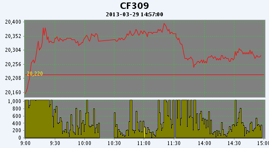 3月29日,鄭棉主要合約低開,早盤增倉上行后盤整,午后在平倉盤壓制下回落震蕩,日線形成低開陽線,日內(nèi)成交量放大,持倉量增加。CF1309合約日成交148130手,日增倉6670手,終盤持倉量148122手;CF1401合約日成交6806手,日增倉734手,終盤持倉量32848手。基本面情況:由于今日為本年度棉花臨時收儲最后一個交易日,為避免交儲違規(guī)情況的發(fā)生,以及盡量避免收儲結(jié)束后現(xiàn)貨難銷帶來的一些風(fēng)險,絕大部分棉企已經(jīng)停止了籽棉收購工作,當前的任務(wù)則是盡快組批、送庫,盡力把最后成交的交儲合同執(zhí)行好。下游方面,全棉紗走量稍有增加,高端紗小幅提價,緊密紡尤為緊俏,紗廠訂單充足,供貨緊張,但整體出貨量稍顯不足。