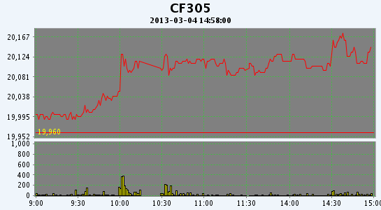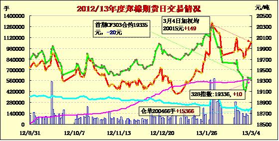 3月4日,鄭棉主要合約平開,早盤橫向整理后在多頭買盤的推動(dòng)下走高,午后區(qū)間盤整,尾盤收強(qiáng),日線形成中陽線,日內(nèi)成交量溫和放大,持倉量增加。CF1305合約日成交5416手,日減倉770手,終盤持倉量29728手;CF1309合約日成交195488手,日增倉14764手,終盤持倉量149942手。基本面情況:市面上資源不多,高等級(jí)棉少之又少,部分地區(qū)現(xiàn)貨幾乎沒有成交,市場較為冷清。新疆方面,由于鐵路貨運(yùn)價(jià)格有所上調(diào),這對皮棉出疆產(chǎn)生一些影響,但總體并不突出。棉副方面,棉油信心不足;棉籽、棉粕堅(jiān)挺;提價(jià)意愿較強(qiáng)。短絨、棉殼下游方面,全棉紗價(jià)格保持,局部范圍正常討價(jià)還價(jià)成交。