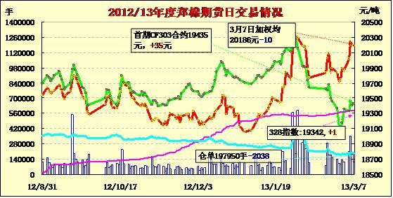 3月7日鄭棉主要合約高開,早盤沖高后在平倉盤打壓下震蕩下滑,終盤收低,日線形成長1/2上影線的陰線,日內(nèi)成交量萎縮,持倉量減少。CF1305合約日成交3462手,日減倉414手,終盤持倉量25864手;CF1309合約日成交111082手,日減倉1814手,終盤持倉量148984手?;久媲闆r:近日天氣狀況有利于籽棉收購、加工,棉企有條不紊地進行中。雖然交儲截止日期日益臨近,但棉企在收購過程中對質(zhì)量要求依然較為嚴格,并且控制好加工時間恰到好處地完成交儲任務(wù)。多數(shù)企業(yè)表示準備3月中旬結(jié)束籽棉收購工作。下游方面,全棉紗市場走量有所增加,但下游坯布服裝企業(yè)訂單稀少,對棉紗的需求不多,多數(shù)企業(yè)仍銷售不暢。