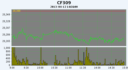 4月12日,鄭棉主要合約小幅低開,早盤后彈后平倉盤的壓力下盤整,午后重心下移,日線形成長上影線的小陰線,日內(nèi)成交量萎縮,持倉量減少。CF1309合約日成交42074手,日減倉3866手,終盤持倉量122318手;CF1401合約日成交2400手,日減倉170手,終盤持倉量31996手。基本面情況:國內(nèi)棉花現(xiàn)貨市場整體成交清淡,價格平穩(wěn)。當前正值春播階段,各地春播開展已經(jīng)陸續(xù)進入初期階段。為穩(wěn)定棉花生產(chǎn)者、經(jīng)營者和用棉企業(yè)市場預期,保護棉農(nóng)利益,保證市場供應,經(jīng)國務院批準,國家發(fā)展改革委會同財政部、農(nóng)業(yè)部、工業(yè)和信息化部、國家質(zhì)檢總局、供銷合作總社、中國農(nóng)業(yè)發(fā)展銀行制定了《2013年度棉花臨時收儲預案》已于昨日公布,收儲預案實行繼續(xù)敞開收儲,臨時收儲價格維持不變,收儲質(zhì)量按新棉花標準執(zhí)行。但不少企業(yè)認為,此次預案,唯一能確認的就是知道20400的價格了,但是有關新棉的質(zhì)量標準、差價是目前企業(yè)比較爭議的一個問題,具體的差價還有待操作細則的進一步明朗。