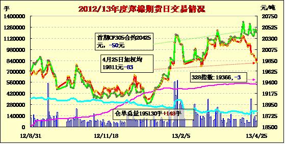 4月25日,鄭棉主要合約小幅低開,早盤下探后在空頭回補(bǔ)支撐下反彈,此后窄幅盤整,日線形成星線,日內(nèi)成交量變化不大,持倉量近減遠(yuǎn)增。CF1309合約日成交62982手,日減倉1852手,終盤持倉量146916手;CF1401合約日成交11624手,日增倉2016手,終盤持倉量38304手?;久媲闆r:紡織企業(yè)主要精力放在購買國儲棉方面,市場現(xiàn)貨成交稀少。在公路、鐵路都有補(bǔ)貼的基礎(chǔ)上,紡企購買新疆庫棉花后,首先爭取鐵路運(yùn)輸,其次選擇公路運(yùn)輸。上周鐵路運(yùn)量上升,日裝車達(dá)到300車左右。今年到新疆包廠的企業(yè)增多,承包費(fèi)也有所上調(diào),并且新國標(biāo)實(shí)施的第一年,不確定費(fèi)用增加,對棉企形成挑戰(zhàn)。近期棉企交儲完畢,普遍進(jìn)入新國標(biāo)學(xué)習(xí)階段,為新年度順利交儲做準(zhǔn)備。