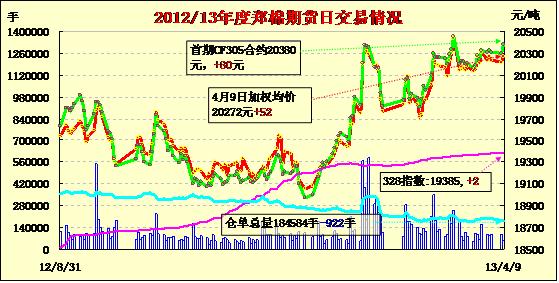 4月9日,鄭棉主要合約小幅低開,早盤下探后在空頭回補提振下反彈,此后窄幅盤整,日線形成陽線星,日內(nèi)成交量萎縮,持倉量減少。CF1309合約日成交51874手,日減倉1408手,終盤持倉量137768手;CF1401合約日成交2042手,日增倉466手,終盤持倉量33098手。基本面情況:國內(nèi)棉花現(xiàn)貨市場整體成交清淡,價格平穩(wěn)。關(guān)于收儲預(yù)案已然確定,近期內(nèi)將公布消息。但在新花或?qū)伋龅念A(yù)期之下,紡企陳花競拍積極性有所下滑,不少紡織企業(yè)已經(jīng)積極等待新花的流出。當前,現(xiàn)貨市場的高等級內(nèi)棉供應(yīng)仍然緊張,各地商品棉庫存量基本見底。長絨棉采購熱情依舊不減,山東等地137級長絨高端報價已至29000元/噸上下,當然仍有部分看漲的棉商有更高端的試探性報價存在,但下游對于高價資源接盤意愿不強,內(nèi)地庫2級新疆陳花報價也多至20800-21000元/噸,品質(zhì)較好的報價至21200元/噸。