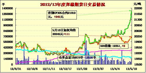 5月10日,鄭棉主要合約平開,早盤放量上沖,隨后橫盤整理。CF1309合約日線形成陽線,CF1401合約形成1/2上影線的陽線,日內(nèi)成交量放大,持倉量近減遠(yuǎn)增。CF1309合約日成交100386手,日減倉13502手,終盤持倉量108530手;CF1401合約日成交19472手,日增倉9502手,終盤持倉量47422手?;久媲闆r:國內(nèi)棉花現(xiàn)貨市場(chǎng)成交清淡,報(bào)價(jià)小幅調(diào)低,整體呈現(xiàn)低迷狀態(tài)。儲(chǔ)備棉投放方面,外棉成交情況較好。因此當(dāng)前市場(chǎng)上清關(guān)外棉低品質(zhì)或低等級(jí)資源局部出現(xiàn)促銷現(xiàn)象,而高等級(jí)資源國內(nèi)外棉花價(jià)格均保持穩(wěn)定。棉籽、棉粕銷售報(bào)價(jià)小幅上漲,棉油、棉短絨、棉殼銷價(jià)保持穩(wěn)定,棉副產(chǎn)品銷售整體表現(xiàn)一般,成交略顯冷清。