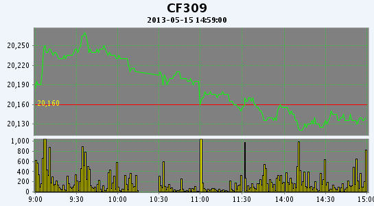 5月15日,鄭棉主要合約小幅高開,早盤沖高盤整,隨后在多頭平倉的壓力下震蕩下滑。CF1309合約日線形成1/2上影線的陰線,CF1401合約形成小陰線,日內(nèi)成交量變化不大,持倉量減少。CF1309合約日成交42522手,日減倉7360手,終盤持倉量86754手;CF1401合約日成交6342手,日減倉198手,終盤持倉量44540手?;久媲闆r:國內(nèi)棉花現(xiàn)貨市場成交清淡,棉價平穩(wěn)。5月份是棉花生長的重要階段,近期黃河流域棉苗生長情況良好,長江流域棉苗已經(jīng)全部移栽,目前長勢也普遍較好。而新疆地區(qū)由于日照時間較長,天氣干燥,棉花生長目前存在缺水狀態(tài),人工灌溉水分流失比較嚴(yán)重。棉副方面,在經(jīng)歷一段上漲之后,外圍行情逐漸平穩(wěn),棉副產(chǎn)品價格也隨勢維穩(wěn),個別地區(qū)產(chǎn)品有所下跌。