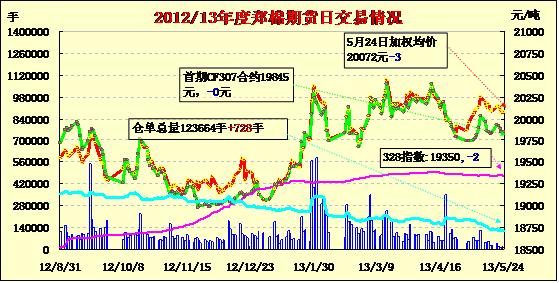 5月24日,鄭棉主要合約低開,盤中橫向盤整,CF1309合約日線形成小陰線,CF1401合約日線形成星線,日內(nèi)成交量變化不大,持倉量近減遠(yuǎn)增。CF1309合約日成交8018手,日減倉1946手,終盤持倉量71100手;CF1401合約日成交3850手,日增倉1190手,終盤持倉量45778手?;久媲闆r:國儲大幅增加了進(jìn)口棉的投放量,較受紡織企業(yè)歡迎。同時也對現(xiàn)貨市場外棉價格造成一定打壓,中間商均表示棉花不好賣,外棉現(xiàn)貨銷售不理想,價格出現(xiàn)下跌。長絨棉銷售差于前期,市場成交很少。不少中間商轉(zhuǎn)關(guān)注力到棉花收購加工。