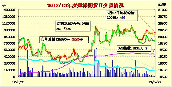 5月27日,鄭棉CF1309合約沖高回落,此后盤整,CF1309合約低開下行盤整,CF1309合約日線形成小陽線星,CF1401合約日線形成小陰線,日內(nèi)成交量變化不大,持倉量近減遠(yuǎn)增。CF1309合約日成交11060手,日減倉824手,終盤持倉量70276手;CF1401合約日成交7332手,日增倉2592手,終盤持倉量48370手?;久媲闆r:國儲(chǔ)投放三萬多噸2011年度進(jìn)口棉,競(jìng)拍激烈,全部成交。進(jìn)口棉的大量投放,帶動(dòng)外盤ICE出現(xiàn)大幅下跌。據(jù)紡企反饋,主要是進(jìn)口棉質(zhì)量及重量上占有優(yōu)勢(shì),受到企業(yè)青睞。昨日再次投放三萬多噸進(jìn)口棉,從競(jìng)拍來看激烈程度較昨日略差,紡織企業(yè)已經(jīng)趨于冷靜,感受到了投放的數(shù)量之大。