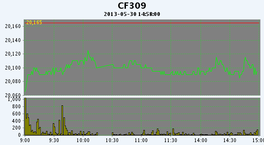 5月30日,鄭棉CF1309合約低開反彈,此后區(qū)間盤整,CF1401合約沖高后于午后盤回落,尾盤收低,日內成交量放大,持倉量下滑。CF1309合約日成交14238手,日減倉1716手,終盤持倉量65294手;CF1401合約日成交7716手,日減倉744手,終盤持倉量45874手?;久媲闆r:國內棉花現(xiàn)貨市場繼續(xù)以維穩(wěn)為主,市場成交清淡。近日隨著國內儲備棉競拍熱度略微下降,一方面與進口棉投放量不穩(wěn)定有關,另一方面下游已逐漸過渡到淡季,用棉量局部呈現(xiàn)萎縮態(tài)勢,短線囤棉尚未到合適時間點。而當前多數(shù)棉花企業(yè)處于停工休假狀態(tài),大部分打算六七月份開始準備新棉收購前期工作。當前新棉長勢情況良好,長江流域已經(jīng)全部移栽完畢,棉苗已經(jīng)長出5片以上真葉。氣候條件在近階段適宜棉苗生長。