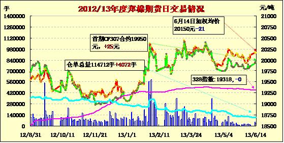 6月14日,鄭棉CF1401合約高開,早盤受到空頭賣盤打壓下滑,午前區(qū)間整理,午后增倉收弱,日線形成高開陰線,日內(nèi)成交量萎縮,持倉量增加。CF1309合約日成交7888手,日減倉4256手,終盤持倉量42996手;CF1401合約日成交22094手,日增倉8188手,終盤持倉量61258手?;久媲闆r:端午節(jié)后第一個(gè)工作日,國內(nèi)棉花現(xiàn)貨市場(chǎng)成交清淡,報(bào)價(jià)小幅調(diào)低。紡織市場(chǎng)淡季,銷售全面減淡,紗線走貨批量持續(xù)縮減,高檔紗銷售尚可,中低價(jià)位紗零散交易,廠家訂單稀少。