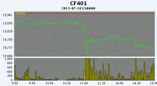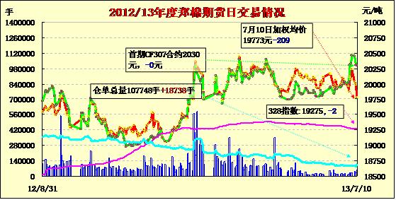 7月10日,鄭棉CF1401合約平開,早盤橫向盤整增倉(cāng),隨后大幅下滑,日線形成陰線,日內(nèi)成交量放大,持倉(cāng)量大幅增加。CF1309合約日成交1540手,日減倉(cāng)652手,終盤持倉(cāng)量17154手;CF1401合約日成交53028手,日增倉(cāng)17382手,終盤持倉(cāng)量71536手。基本面情況:國(guó)內(nèi)棉花現(xiàn)貨市場(chǎng)持續(xù)低迷,市場(chǎng)停頓不前,價(jià)格小幅調(diào)低。進(jìn)入汛期,不少棉區(qū)降雨頻繁,連續(xù)不斷的降雨使得棉農(nóng)田間工作受影響,而更多地是新棉長(zhǎng)勢(shì)也或多或少受到影響。隨著產(chǎn)棉大省山東、河北今年降雨又比較多,7月份正值棉花生長(zhǎng)關(guān)鍵時(shí)期,連續(xù)的陰雨尤其是大雨天氣將增加花蕾脫落率,影響棉花的品質(zhì)及產(chǎn)量,不少棉農(nóng)開始期盼天氣放晴,好保障新棉今年有個(gè)好收成。