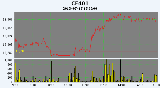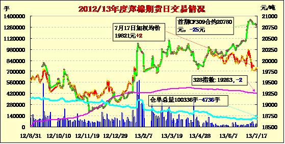 7月17日,鄭棉CF1401合約低開,早盤區(qū)間震蕩,午后在空頭集中回補(bǔ)推動(dòng)下走高,日線形成1/2下影線的陽線,日內(nèi)成交量下降,持倉量減少。CF1309合約日成交544手,日減倉268手,終盤持倉量14758手;CF1401合約日成交30438手,日減倉4468手,終盤持倉量67578手?;久媲闆r:受今年第7號(hào)臺(tái)風(fēng)“蘇力”的影響,安徽池州14日-15日出現(xiàn)明顯降雨,溫度也隨之下降到24-29攝氏度之間,但由于降雨量不大,兩天加起來降雨時(shí)間只在5個(gè)小時(shí)左右,風(fēng)力也只是3-4級(jí)的微風(fēng),沒有對棉花生長產(chǎn)生不利影響,補(bǔ)充了棉田水分。16日當(dāng)?shù)氐奶鞖忾_始放晴,氣溫也隨之增高在27-33攝氏度,對棉花開花成桃非常有利。