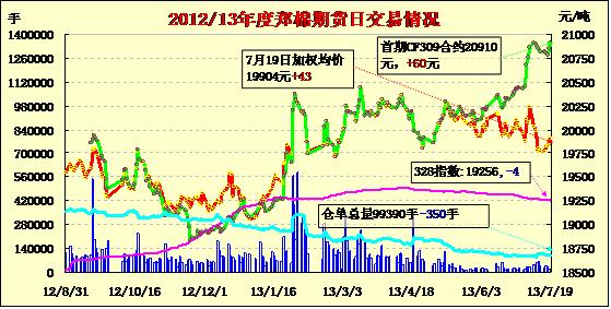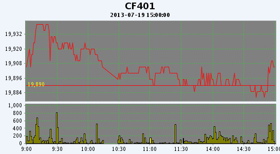 7月19日,鄭棉CF1401合約高開,早盤上試后在平倉盤壓制下回落,尾盤反彈,日線形成星線,日內(nèi)成交量下降,持倉量減少。CF1309合約日成交516手,日減倉270手,終盤持倉量14164手;CF1401合約日成交18646手,日減倉282手,終盤持倉量65926手?;久媲闆r:受多數(shù)紡織企業(yè)積極競(jìng)拍國儲(chǔ)棉的的影響,現(xiàn)貨市場(chǎng)銷售繼續(xù)疲軟。地產(chǎn)棉4級(jí)皮棉報(bào)價(jià)為18500元/噸,5級(jí)皮棉報(bào)價(jià)為16700元/噸,均較上周同期下降了100元/噸,喀麥隆SM1-1/8報(bào)價(jià)為19200元/噸,巴西棉SM1-1/8報(bào)價(jià)為19100元/噸,美棉SM報(bào)價(jià)為18600元/噸,保持平穩(wěn),但成交清淡。