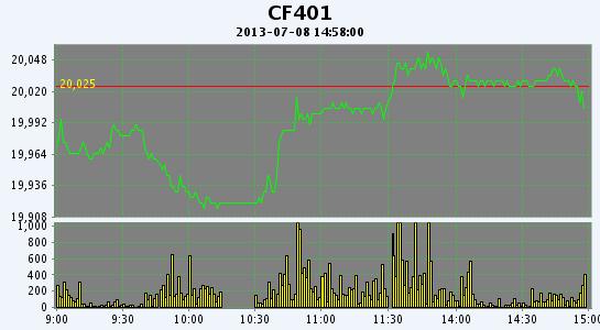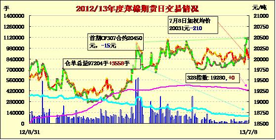 7月8日,鄭棉CF1401合約小幅高開,早盤下試后反彈盤整,午后在多頭買盤支撐下回升,日線形成陽線,日內(nèi)成交量放大,持倉量增加。CF1309合約日成交2060手,日減倉1018手,終盤持倉量19038手;CF1401合約日成交43530手,日增倉4336手,終盤持倉量61498手。 基本面情況:棉花現(xiàn)貨價(jià)格維持平穩(wěn),成交依然冷清,但個(gè)別地區(qū)詢價(jià)增多。紗線市場(chǎng)需求繼續(xù)疲軟,價(jià)格下行,高支紗、精梳紗也有走低。儲(chǔ)備棉投放進(jìn)入最后一個(gè)月,近日投放資源放量,但交易商關(guān)注熱度不高,本周成交量有所回落。棉副市場(chǎng)成交不多,國內(nèi)棉籽資源量見底,山東棉粕、棉殼報(bào)價(jià)上揚(yáng),傳利好信號(hào)。