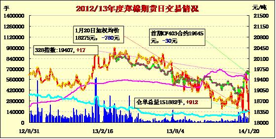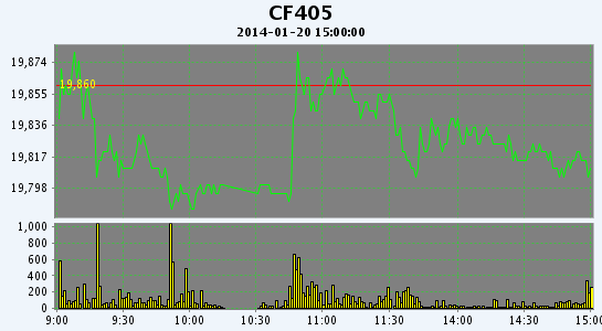 1月20日,鄭棉CF1405合約低開,早盤調(diào)整后在多頭買盤支撐下反彈,午后受平倉盤壓制回落,日線形成小陰線,日內(nèi)成交量萎縮,持倉量減少。CF1405合約日成交23610手,日減倉1872手,終盤持倉量74524手;CF1409合約日成交4002手,日減倉1254手,終盤持倉量27874手。