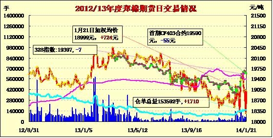 1月21日,鄭棉CF1405合約平開,盤中在多頭平倉打壓下盤跌下滑,午后受集中買盤推動回升整理,日線形成長下影線的陰線星,日內(nèi)成交量放大,持倉量增加。CF1405合約日成交35064手,日增倉458手,終盤持倉量74982手;CF1409合約日成交2606手,日減倉468手,終盤持倉量27406手?;久媲闆r:《2014年中央一號文件》指出將啟動新疆棉花目標(biāo)價格補(bǔ)貼試點;近期港口外棉價格繼續(xù)上漲,高于紡企心里價位,近期新定買單很少。